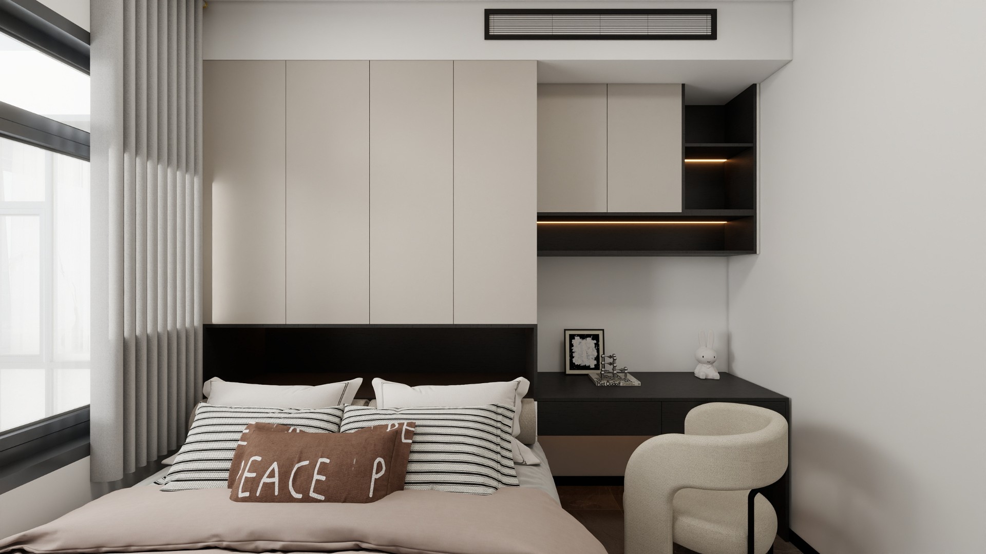 色彩体系:以米白、浅灰、暖棕为基础色调,避免冷硬感;局部用奶茶色、浅原木色、低饱和莫兰迪色(如浅粉、淡绿)作为点缀,通过色彩的柔和过渡营造温馨氛围,同时保持现代风格的清爽感。