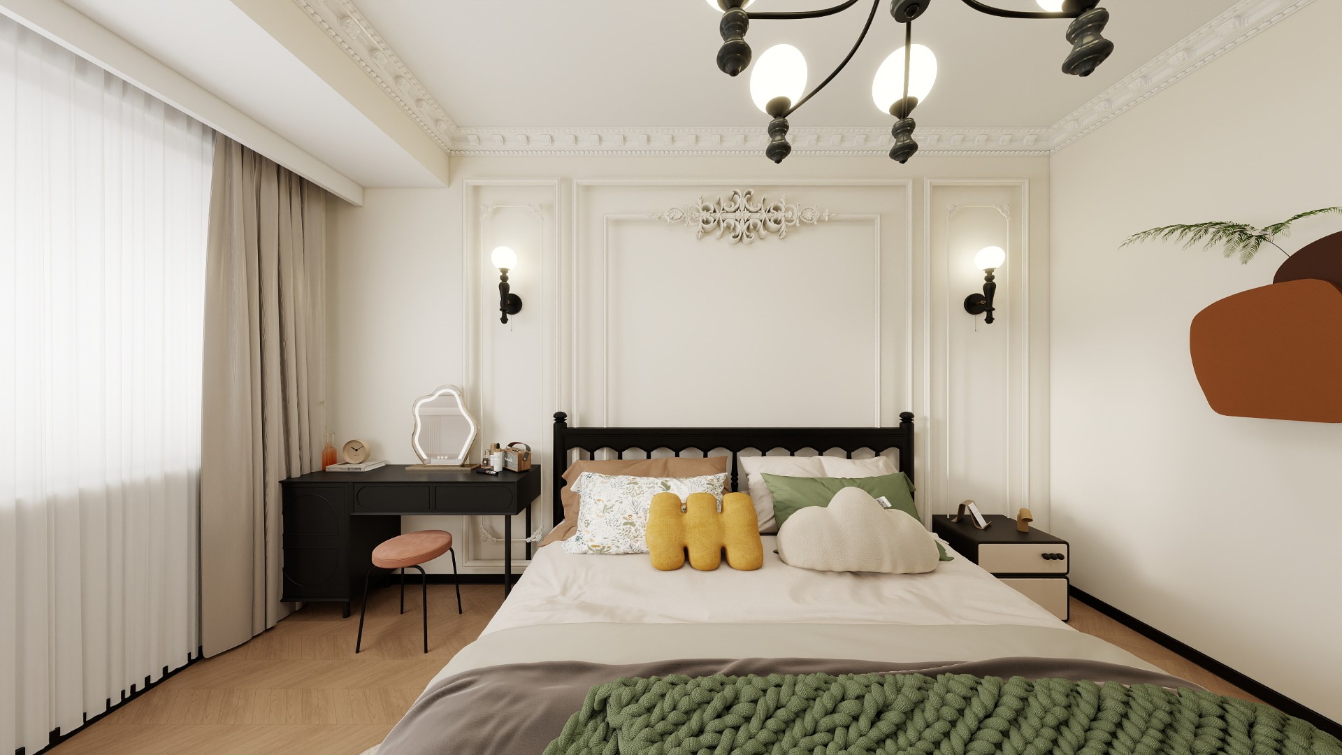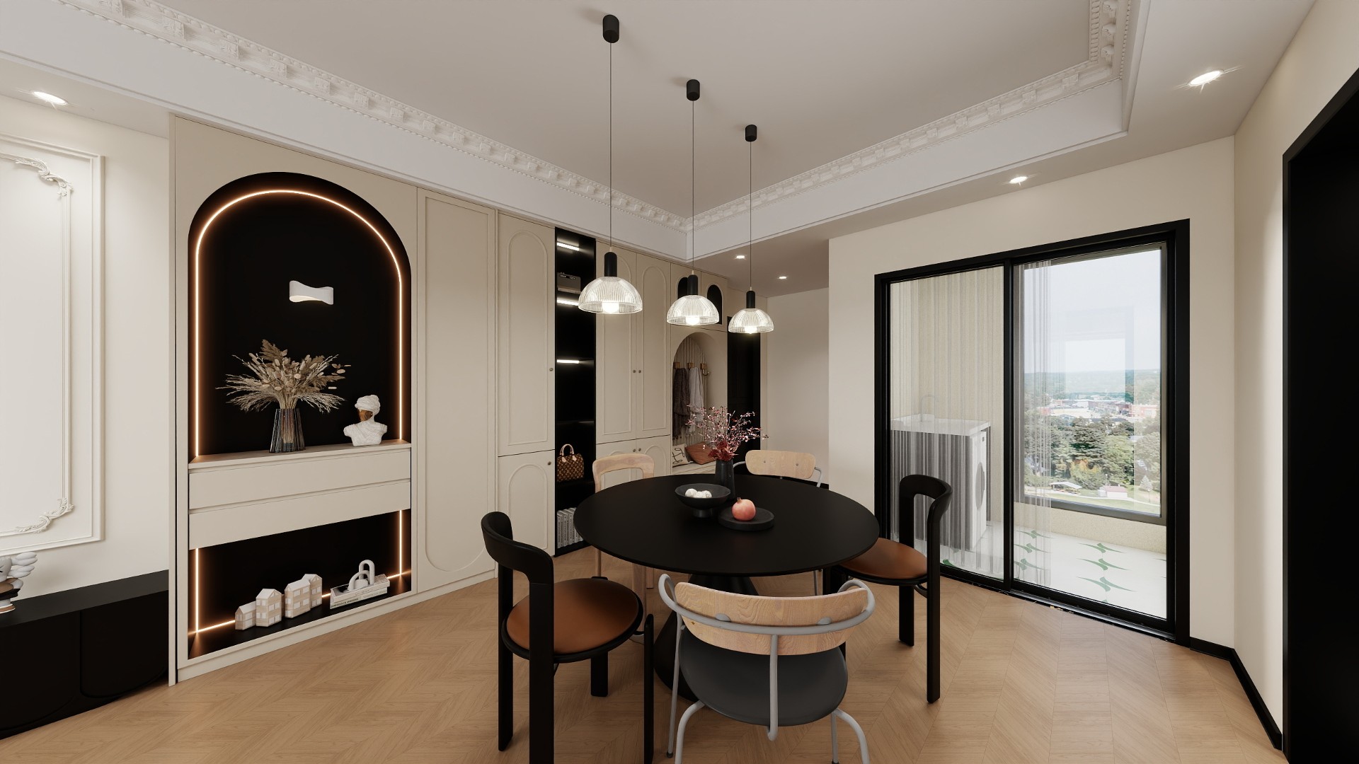 线条与结构:横厅顶部采用简化的石膏线造型,搭配少量弧形垭口或罗马柱装饰,弱化硬朗棱角;墙面以护墙板拼接乳胶漆,分缝处嵌入金属线条,呼应法式经典的对称与层次美。