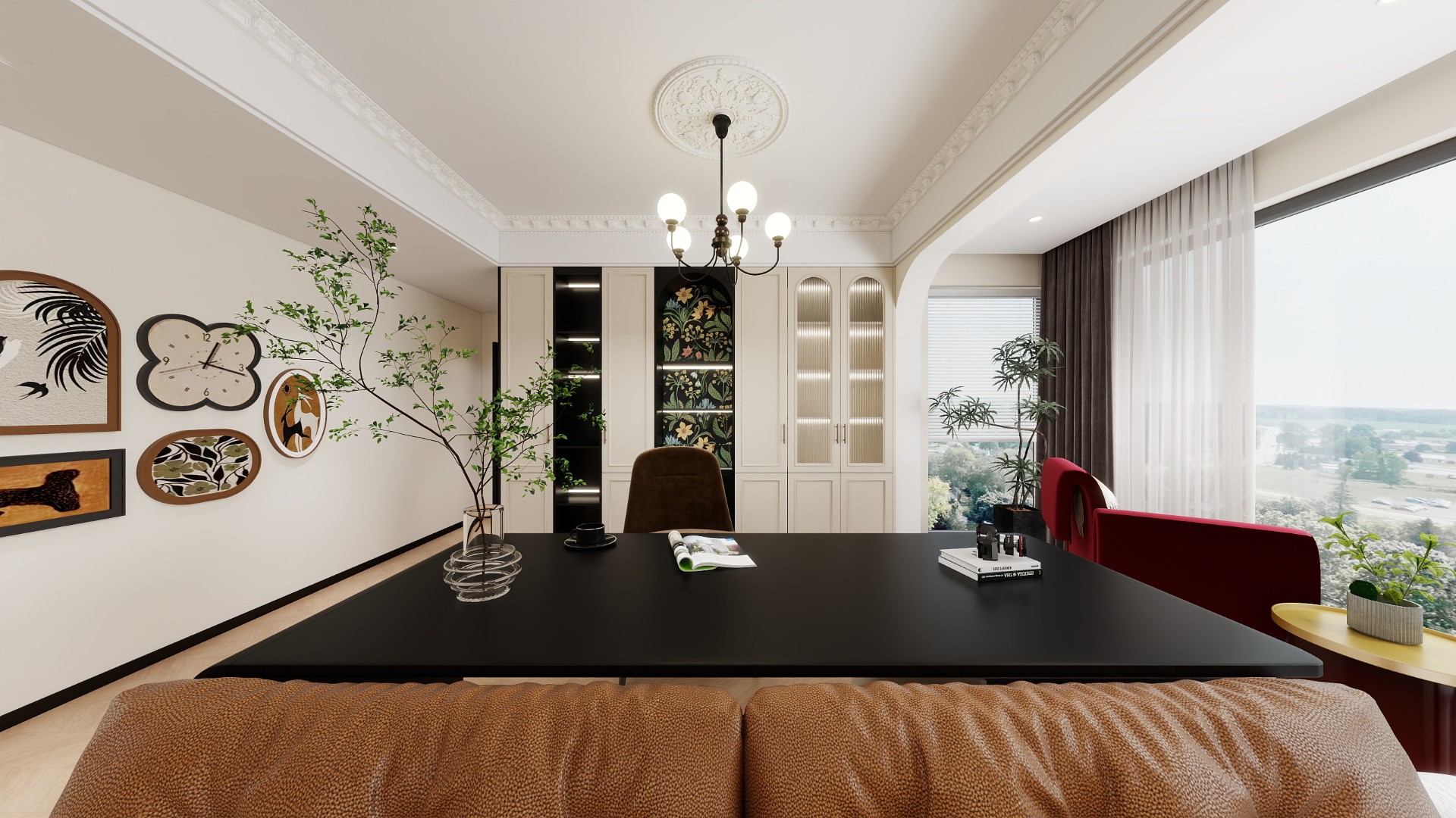功能与氛围:横厅一侧设L型沙发区,搭配复古壁炉造型(可做装饰或储物);另一侧规划餐区,摆放长形实木餐桌与高背餐椅,顶部悬挂水晶吊灯或铁艺烛台灯;通过落地窗帘(优选亚麻、丝绒材质)、复古挂画、绿植(龟背竹、琴叶榕)等软装,营造慵懒而精致的法式氛围。