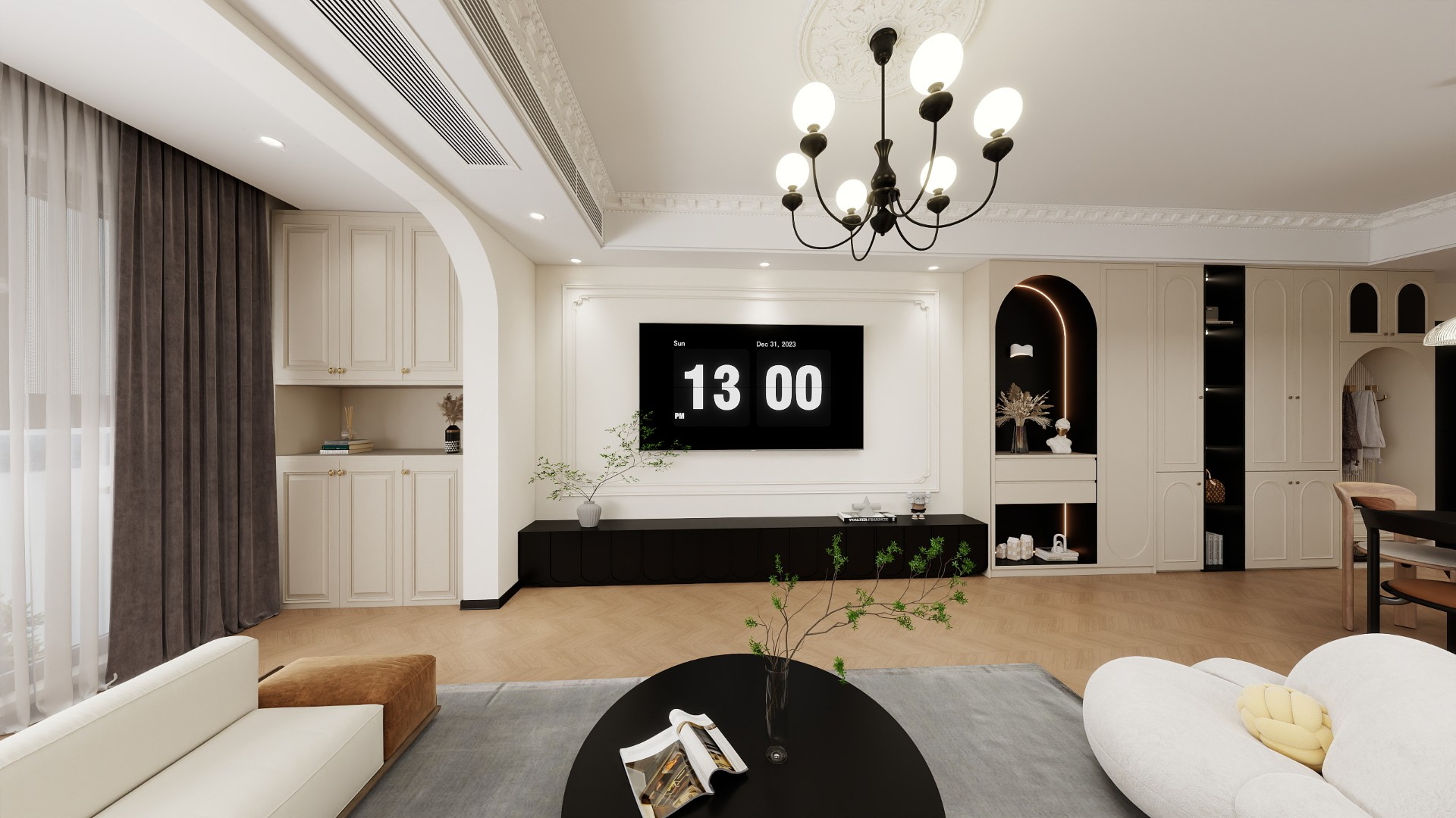 设计说明:将原套三格局打通整合为套一,以横厅为核心承载客、餐、休闲等复合功能,通过开放式布局放大空间尺度,同时保留法式复古的浪漫仪式感,让复古美学与现代生活需求深度融合。